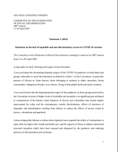 In a historic statement released this week, the United Nations Committee on the Elimination of Racial Discrimination (CERD) starkly warned that “only 15.21% of the population of low-income countries has received even one vaccine dose, creating a pattern of unequal distribution within and between countries that replicates slavery and colonial-era racial hierarchies.” As the Committee notes, under the International Convention for the Elimination of All Forms of Racial Discrimination, States are obligated to eliminate all forms of racial inequities.